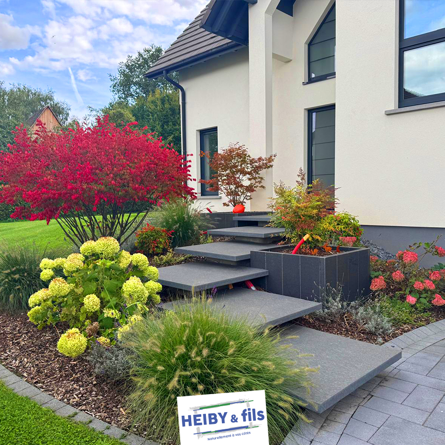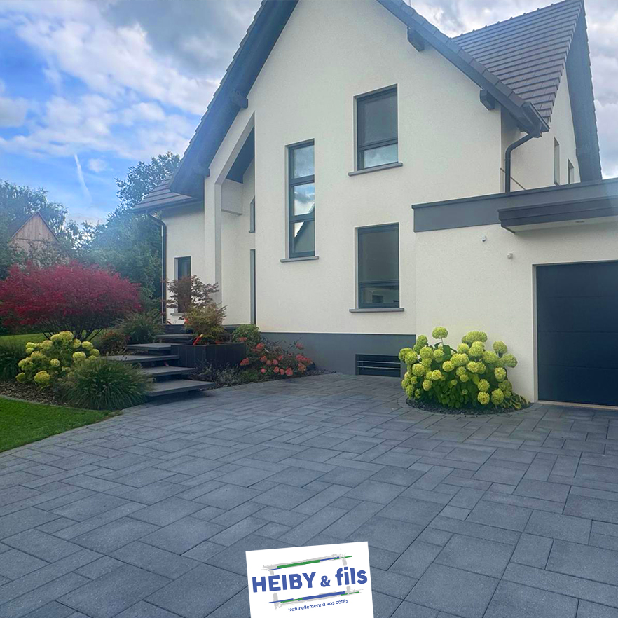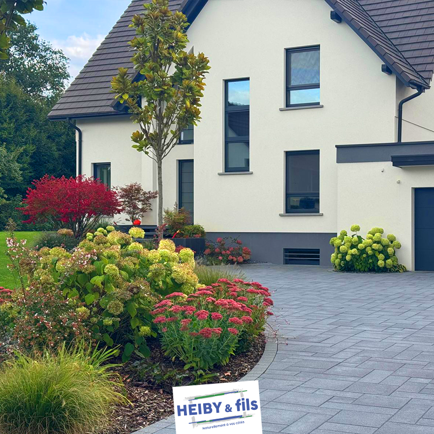 Un projet complet qui allie modernité et élégance 🪴 Des massifs paysagers soigneusement travaillés, mêlant couleurs vives et végétation structurée pour mettre en valeur la façade. 🪜 Un escalier d’entrée design, réalisé en dalles modernes, qui crée une entrée accueillante et contemporaine. 🧱 Un pavage sobre et élégant qui habille l’allée et le garage, offrant un rendu uniforme et raffiné. 🌳 Un gazon parfaitement intégré pour sublimer l’ensemble et donner une touche naturelle et harmonieuse. #Heiby #Alsace #Paysagiste #Nature #EspacesVerts #Plantes #Décoration